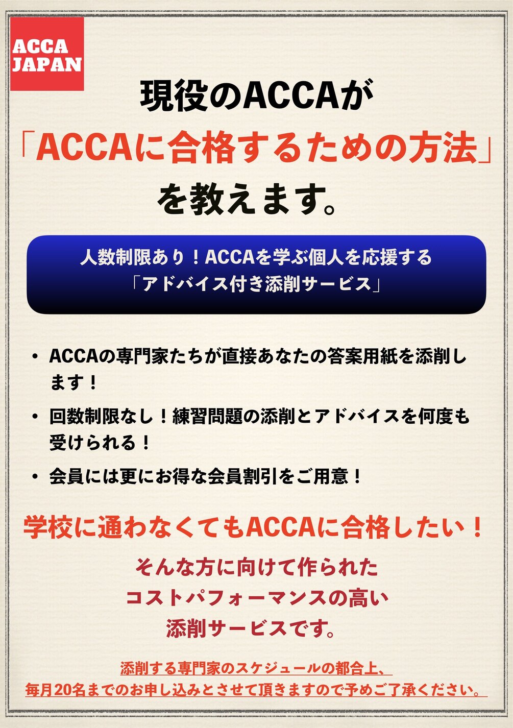 - 会員様が解いた練習問題、答案用紙、そして模範解答をメールでお送りいただき、ACCAの専門家が添削を行います。現在はボーナス期間ということで、マニュアルの著者である澤柳氏もここに含まれています!
